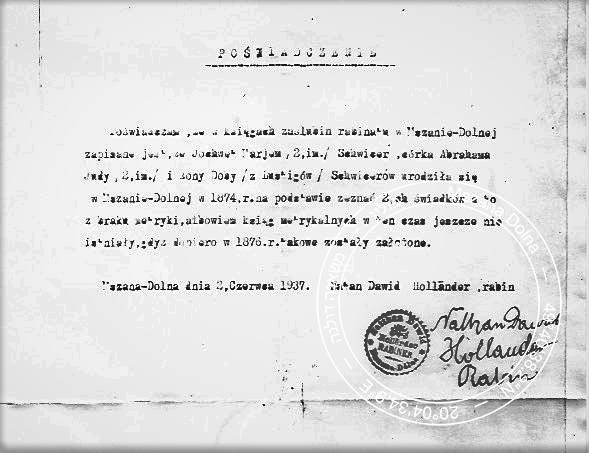 The family of the rabbis of Mszana Dolna came from Lviv, the place of origin of the town’s first rabbi, Josef Holländer. According to Josef’s New York-based great grandson, Elieazar Zobremann, who is the main source of information on the subject of the rabbi’s family, Josef’s wife Chana was a daughter of the chief rabbi of Lviv. The Holländers arrived to Mszana Dolna about 1875. This dating is supported by a later document, Jochwed Schwitzer’s birth certificate issued on the basis of two witnesses’ testimonies, with the annotation stating that “at the time [of Jochwed Schwitzer’s birth, i.e. 1874] the record books did not exist yet, as they were established only in 1876.” The certification bears the seal and signature of Natan Holländer, Josef's son who was the second and at the same time last but one rabbi of Mszana Dolna. For the Holländers, originating from a major city with its own university and rich cultural life, Mszana Dolna, with its mostly wooden architecture, dirt roads, and ubiquitous mud, must have been a culture shock. They stayed in the town nevertheless; Josef established a rabbinical office, and at the turn of the 20th century a large brick synagogue was built. The rabbi’s family lived in a building on the main market square near the synagogue, rented from the Mitan family; according to O. Illukiewicz, it was at no. 11.The office of the rabbi of Mszana Dolna was held by three Holländers. After Josef’s death in 1912 he was succeeded by his son Natan Dawid. Courtesy of his grandson, Eli, his photo can be presented on this website. There are very few preserved memories of the rabbi. When interviewed on 28 December 2009, Henryk Zdanowski could not even remember his name. It seems the rabbi must have been a very modest person. In his memoirs on the Jews of Mszana Dolna, Aleksander Kalczyński writes that the relations between the rabbi and the parson of the nearby parish were remarkably good, and the two men even treated each other to matzah and cake on the holidays. The synagogue had its own cheder. The Jewish religious school was probably run by the rabbi. In the state-run primary school the Jewish religion was taught for 6 hours a week by Abraham Arbeit from Maków (Illukiewicz, 128).
