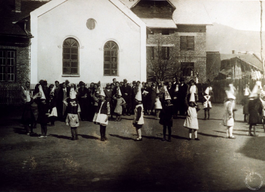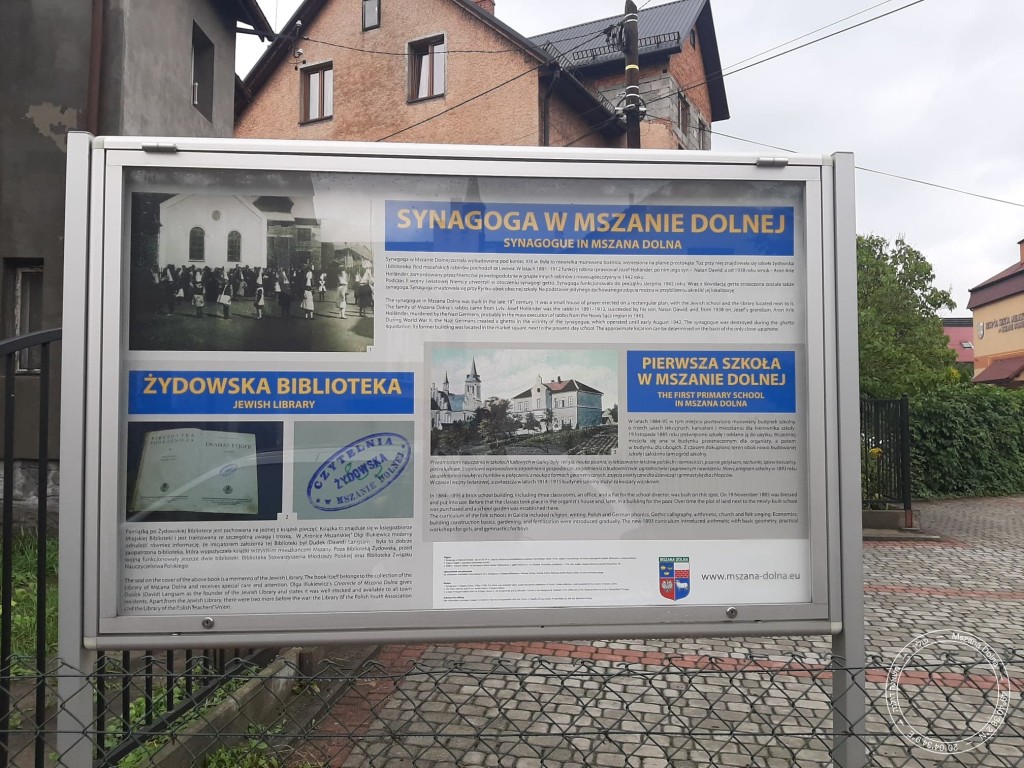 The synagogue in Mszana Dolna was built at the end of the 19th century. It was a brick building constructed on a rectangular plan. It was built of plastered bricks, had high long vertical windows with curved tops and a round skylight under the roof. Unfortunately, no information on the interior has survived, and there are very few photos presenting the synagogue from the outside. The most valuable photograph shows children and their parents, apparently during some kind of a celebration, against the background of a white wall of the synagogue. According to Anna Kadłubek, who shared the photo, the first man on the left is Mr Stachura, a P.E. teacher. At first, it was thought that the picture shows one of the Jewish holidays such as Purim, which would be logical given the children are wearing special triangular caps. However, considering the immediate vicinity of the primary school, it cannot be ruled out that the photo presents a school-related celebration. Still, there may be Jewish children and their parents in the picture as well, as Jewish and non-Jewish children attended the same school. The wooden fence between the synagogue and the square where the children are standing also suggests it is a school-related event rather than a religious one. The synagogue was located in the immediate vicinity of the school, the market square, and the Catholic parish church. During WW2, its building has been demolished on Nazi orders, with the “Aryan” inhabitants of the town allowed to take the building materials for themselves. Unfortunately, there were people all too eager to take that possibility. Some materials from the former synagogue were used for farm buildings, including a stable. The synagogue equipment—excluding the most valuable items, which had been stolen by the Germans—was left on the Main Market Square and taken by the non-Jewish inhabitants. The same fate befell the books from the synagogue’s cheder. Anna Kadłubek recounts piles of books which children used as slide, another witness remembers the leather from the book binding which was used as a material for his mother’s school backpack. In 2017, Shtetl Mszana Dolna took initiative to commemorate the location of the former synagogue with a suitable information board. The project took 3 years to be completed, but finally the board was set up exactly on the spot where the Jews used to pray to God in their synagogue, which was allowed to exist in Mszana for less than 50 years.