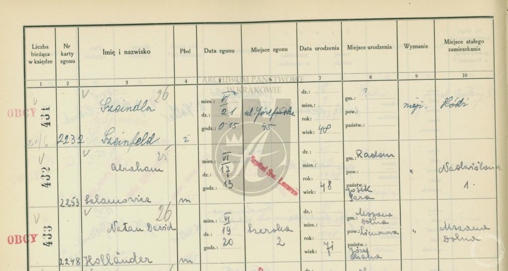 Natan Dawid Holländer passed away on 19 June 1938 at 8 p.m. in Kazimierz, Kraków, at ul. Szeroka 2, following some serious health problems. He was 71 years old. His office and duties were taken over by his son, Aron Arie (Lejb) Holländer. The last, third rabbi of the town was born in Mszana Dolna on 7 May 1910. He was only 28 when he had to start leading the Jewish religious community in Mszana Dolna, and he held his office in the most difficult period: the time of the war and extermination of his people. He was murdered before the massacre of the entire community took place, probably during the execution of the group of rabbis from the Nowy Sącz region in 1942. His family, including his wife Bejla Perel (born 18 May 1907) and his children—Chaim Josef, aged 11, Chaja Mirl, aged 9, Ester, aged 8, and Chaskiel, aged 6, were murdered on 19 August 1942. The list of the victims of the mass murder also includes Adela Holländer (born 1879), Natan Dawid’s wife and the mother of the last rabbi of Mszana Dolna. Natan Dawid’s brother Abraham (born in 1897), as well as his family—his wife Malka and their three children, who were killed on the same day.