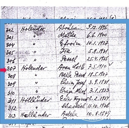 The names of rabbi Aron Lejb Holländer and his family on the list of Jews living in Mszana Dolna drafted on 15 June 1942. A note next to Aron’s name indicates he was not killed in the mass murder of 19 August 1942.
