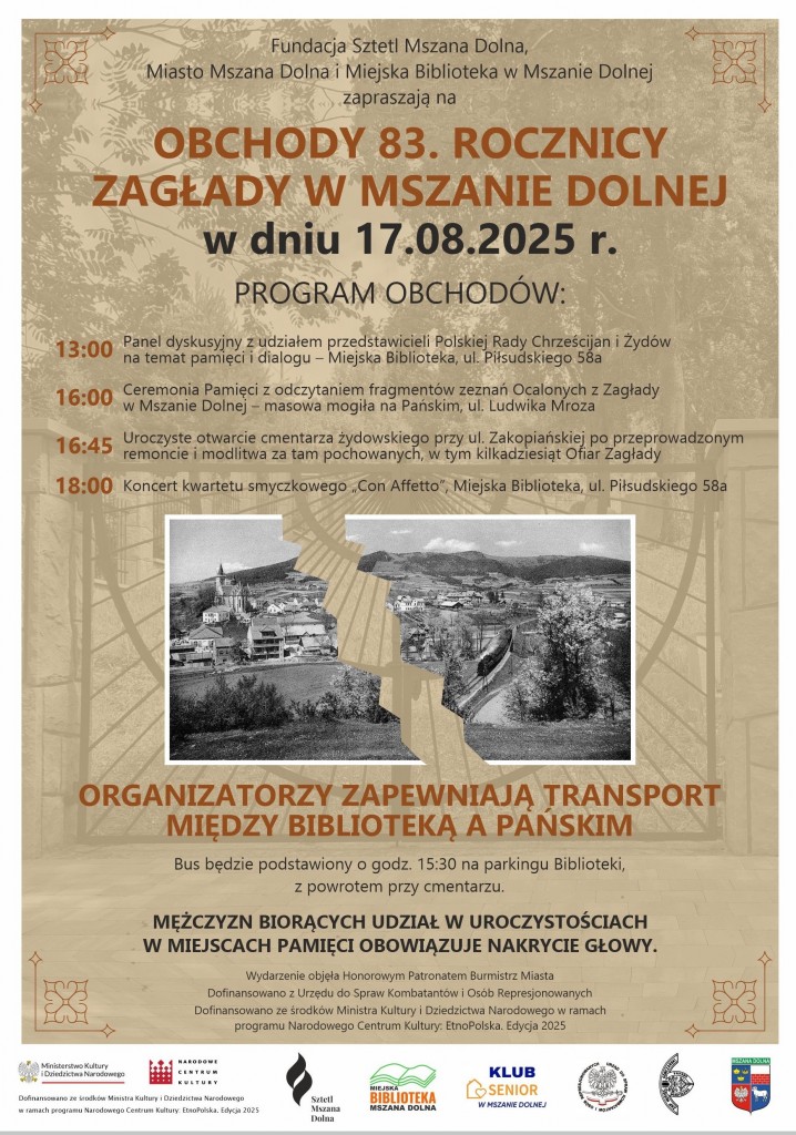 Zbliża się 83. Rocznica Zagłady w Mszanie Dolnej. Nasze miasto straciło w niej ponad tysiąc obywateli, wśród zamordowanych byli także Żydzi z okolicy, przesiedleni i przybyli z innych miast oraz grupa chrześcijan żydowskiego pochodzenia. Największa zbiorowa egzekucja ludności żydowskiej miała miejsce 19.08.1942 r. w wąwozie na Pańskim.