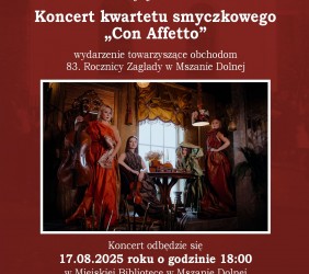 Po uroczystościach, o godz. 18:00 zapraszamy na Koncert Kwartetu Smyczkowego „Con Affetto”, także w Bibliotece, ul. Piłsudskiego 58a. Wstęp wolny.