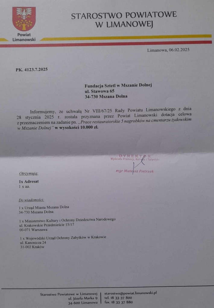 Szanowni Państwo, otrzymaliśmy - symboliczne wprawdzie, ale jednak - dofinansowanie na renowację macew, od Powiatu Limanowskiego. Przyznana kwota wystarczy tak naprawdę na niewiele więcej niż odnowienie jednej macewy, ale mieć odnowiony zabytkowy nagrobek lub nie mieć, to istotna różnica! Jesteśmy zatem wdzięczni, bo to kolejny krok, kolejna ocalona historia, jedyny ślad po człowieku, który niegdyś żył na naszej ziemi, spoczął w niej i powinien tu być pamiętany.