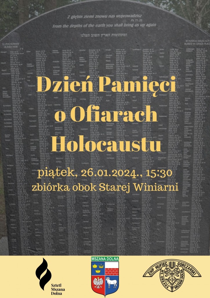 Wraz z władzami Miasta Mszana Dolna oraz Hufcem ZHP "Gorczński", zapraszamy mieszkańców miasta i gminy Mszana Dolna, przedstawicieli szkół, władz, instytucji, do wspólnego uczczenia pamięci Ofiar Zagłady. Spotykamy się w piątek, 26.01.2024 r. o 15:30 przy ul. Ogrodowej, przy Starej Winiarni. Międzynarodowy Dzień Pamięci o Ofiarach Holokaustu przypada w sobotę 27.01.2024 r., jednak ze względu na szabat, gdy zgodnie z zasadami judaizmu, nie odwiedza się cmentarzy, przenieśliśmy obchody na piątek. Serdecznie zapraszamy wszystkich ludzi dobrej woli. Trzeba pamiętać!
