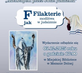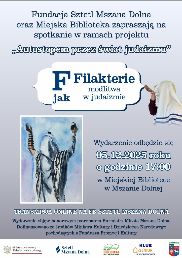 5.12.2025 w Miejskiej Bibliotece w Mszanie Dolnej odbyło się nasze kolejne, przedostatnie już w tym roku, spotkanie w projekcie „Autostopem przez świat judaizmu”. Tym razem poświęcone było modlitwie żydowskiej i związanymi z nią przedmiotami, szczególnie filakteriom i modlitewnikom.
