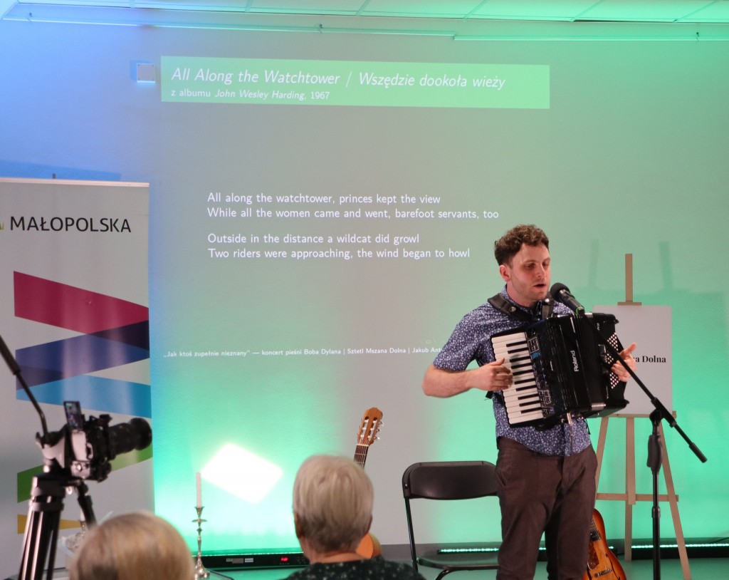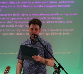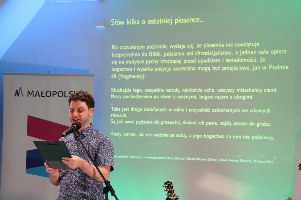 Jakub finalizuje właśnie pierwszy w Polsce doktorat poświęcony Dylanowi, stąd koncert wzbogacony był wykładem z kontekstami biblijnymi utworów, ich osadzeniu w tradycji żydowskiej i chrześcijańskiej oraz sytuacji społeczno-politycznej, w jakiej powstawały.