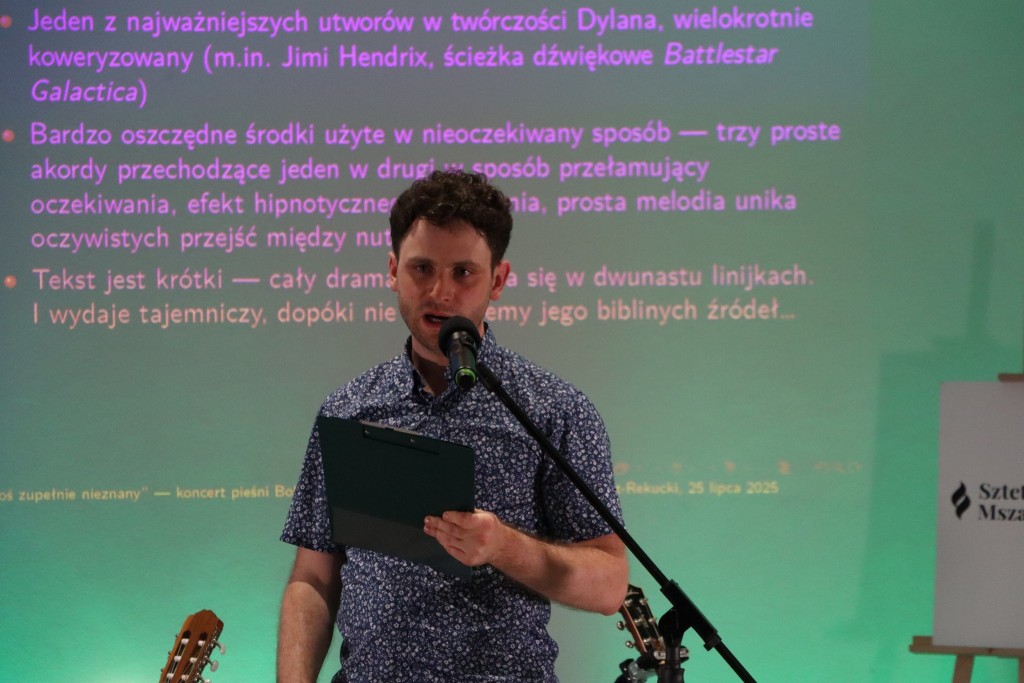 Jakub przedstawił zupełnie nowe tłumaczenia znanych utworów noblisty, zaśpiewał także fragmenty w angielskim oryginale, akompaniując sobie na gitarze klasycznej, pół-akustycznej i akordeonie. Zaś dzięki przedstawieniu bogactwa wątków znaczeniowych, osadzonych w ogromnej mierze w kontekstach biblijnych obydwu Testamentów, dla uczestników wydarzenia Bob Dylan stał się kimś mniej "zupełnie nieznanym".