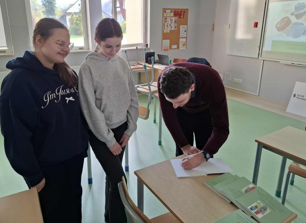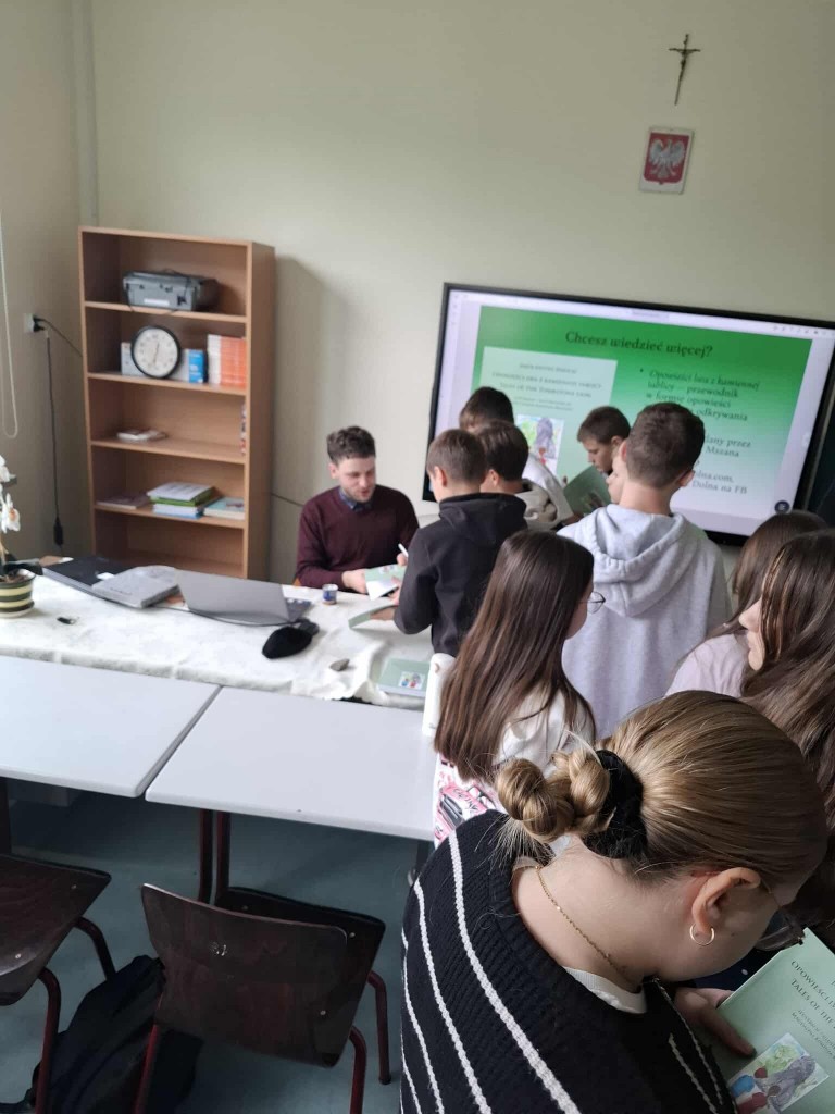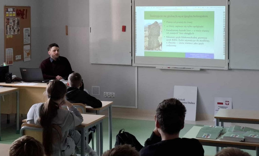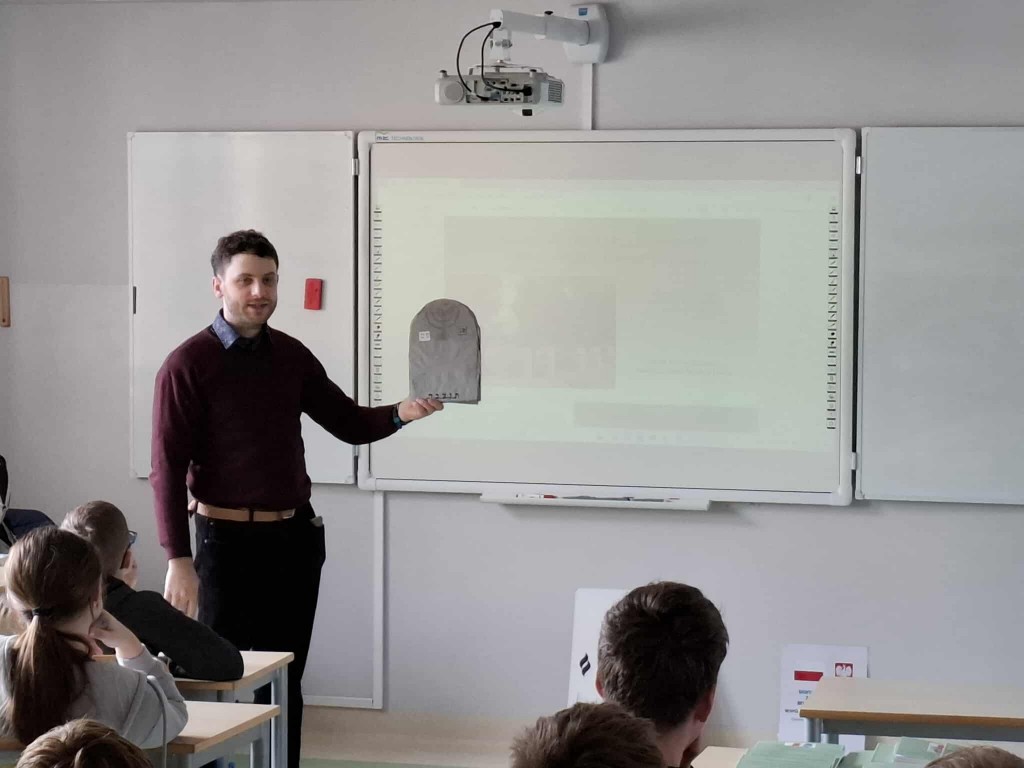 Jakub Antosz-Rekucki, opowiedział młodzieży nie tylko o samej publikacji, ale też o znaczeniu podtrzymywania pamięci i poznawaniu kultury dawnych mieszkańców naszego miasta i gminy.