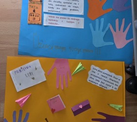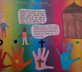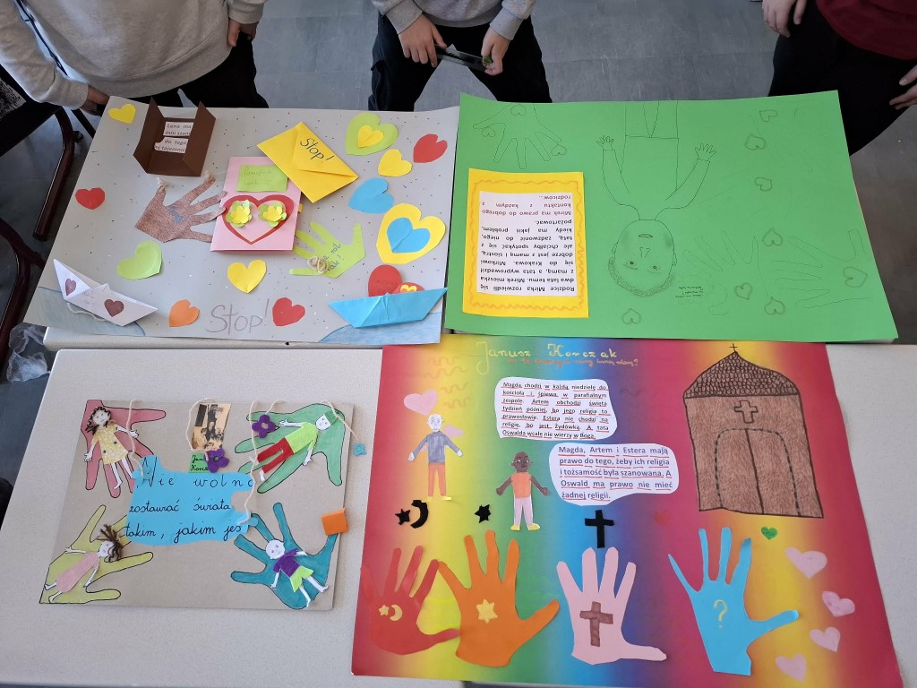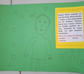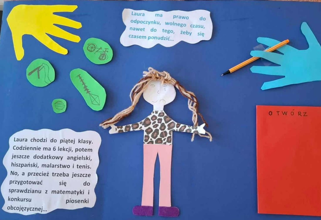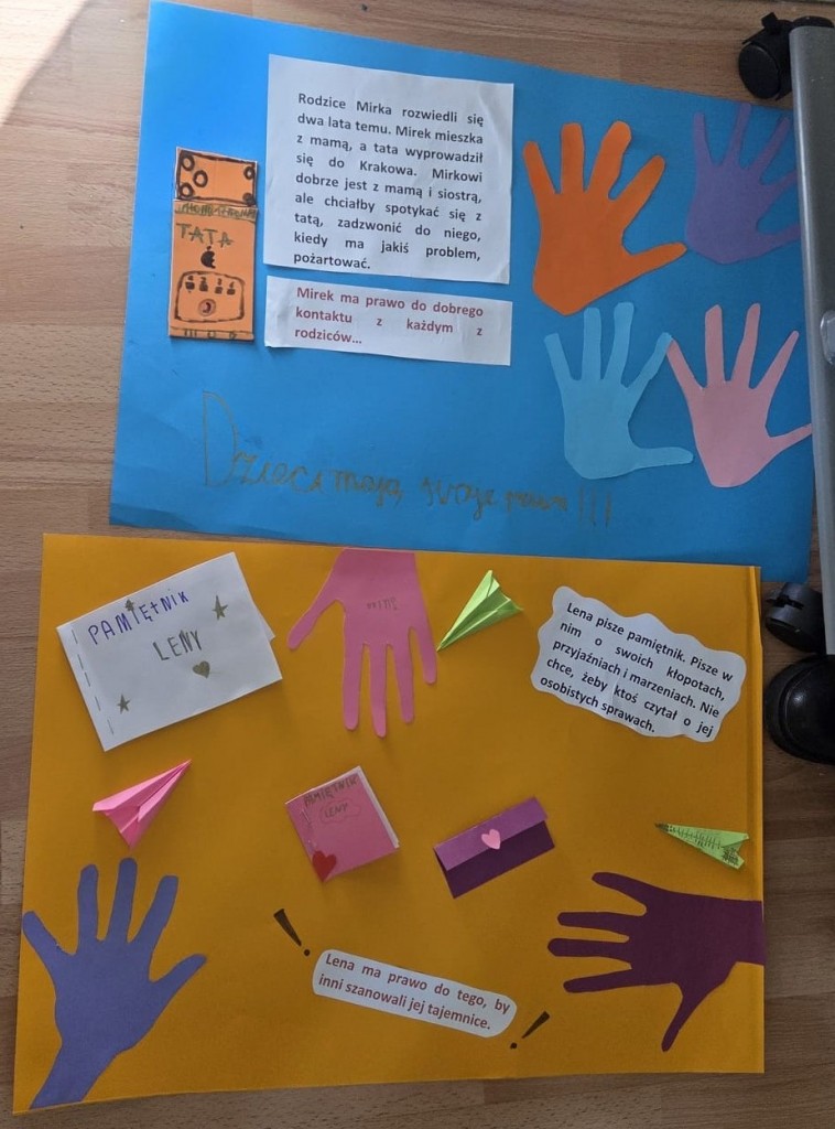Lektura i jej omówienie, były podstawą do rozmowy z uczniami na temat prawa dziecka. W dalszej części uczestnicy wykonali plakaty promujące te prawa.