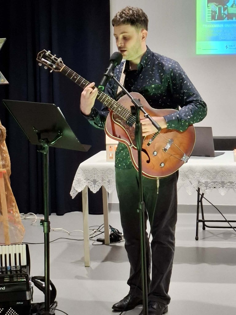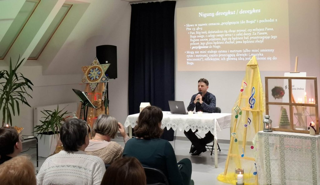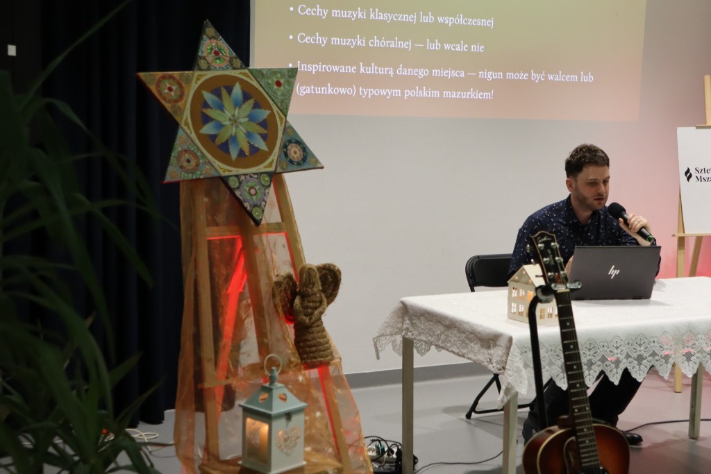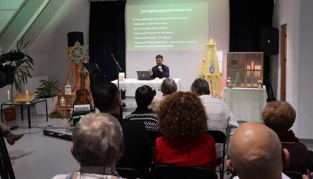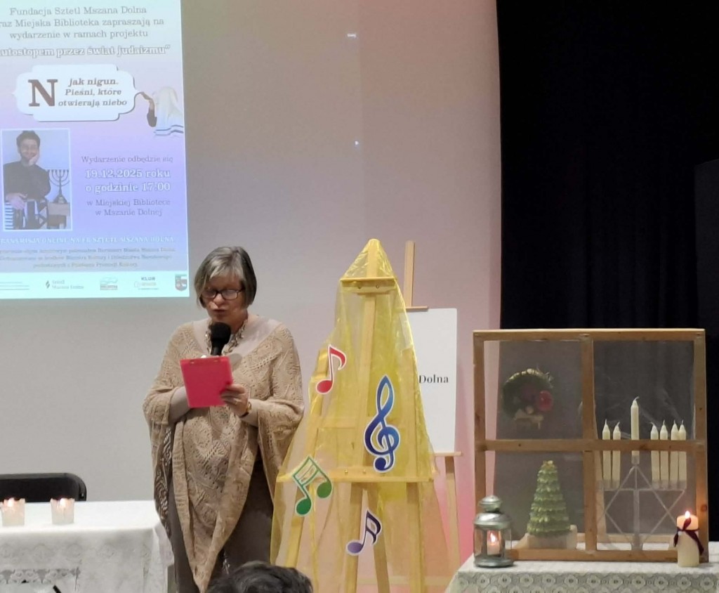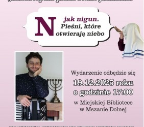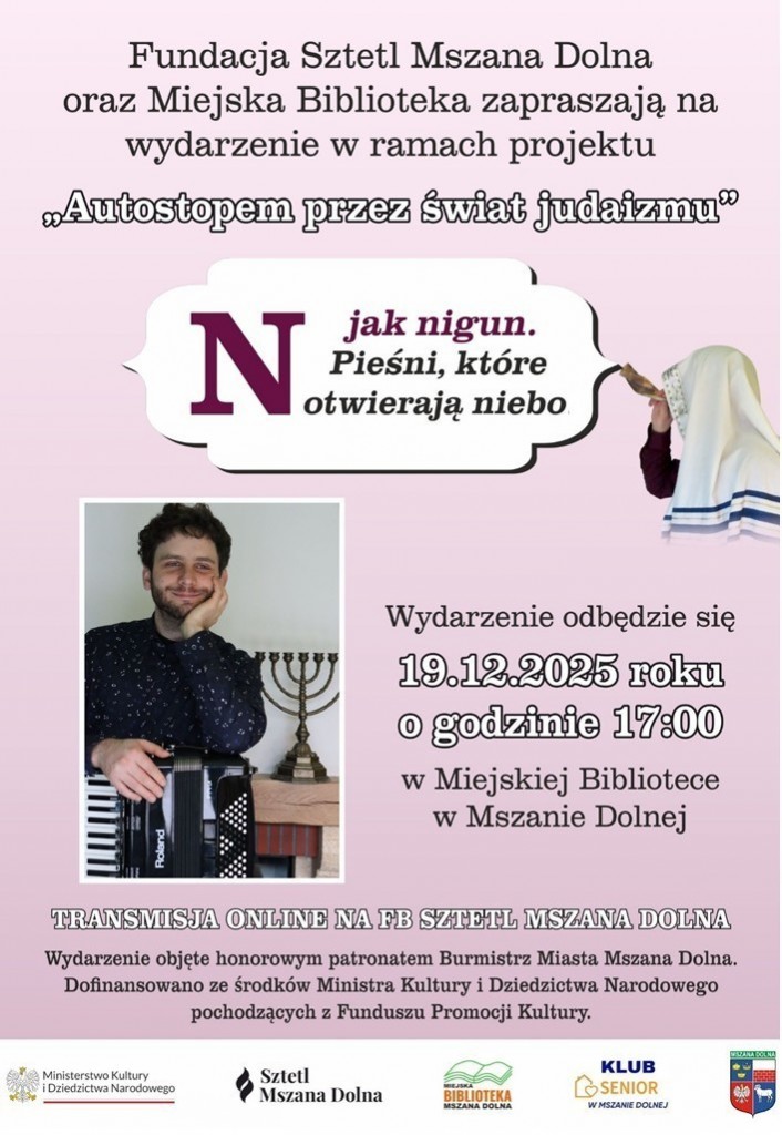 19.12.2025 r. w Miejskiej Bibliotece w Mszanie Dolnej odbyło się ostatnie spotkanie naszego projektu ”Autostopem przez świat judaizmu”. Było poświęcone nigunom - trudnym do jednoznacznego zdefiniowania modlitewnym pieśniom żydowskim. Temat przedstawił – zarówno od strony teoretycznej, jak praktycznej: śpiewem, akompaniując sobie na akordeonie i gitarze, Jakub Antosz-Rekucki, językoznawca, badacz poezji melicznej.