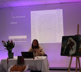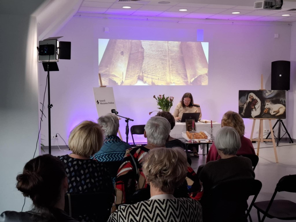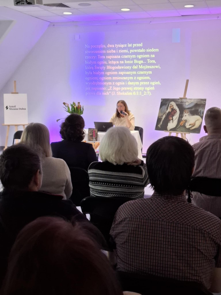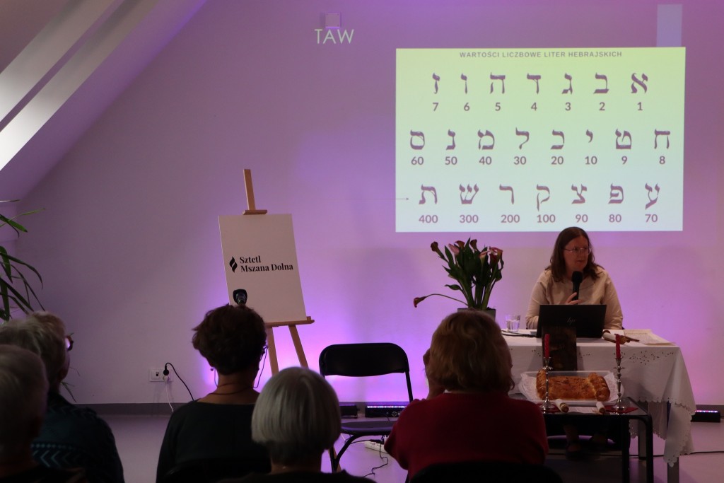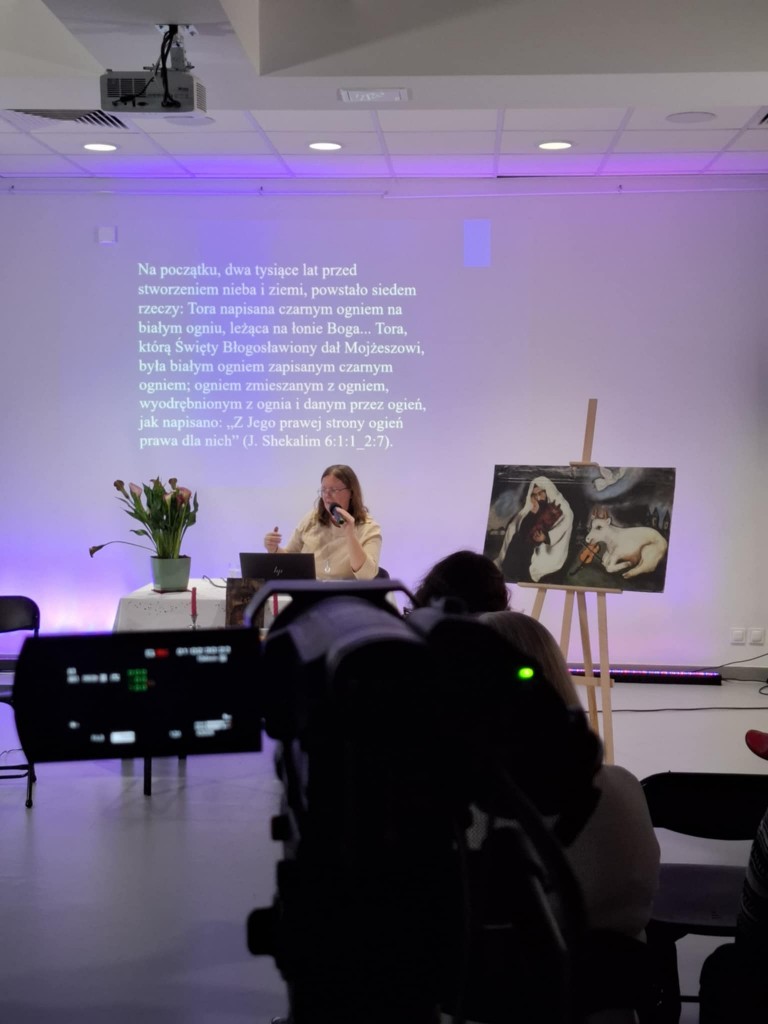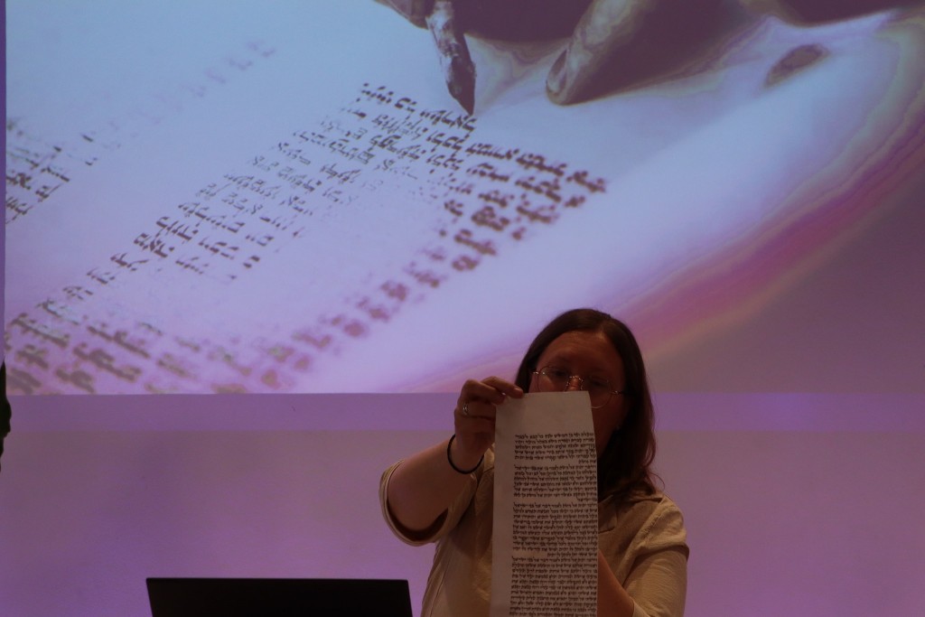 Ci, którzy byli na miejscu, mogli wziąć do ręki fragment zwoju, jad do wodzenia po świętych literach, zwój Estery - jedyny, jaki ozdabia się ilustracjami. Ci biorący udział online, byli tym razem wyjątkowo aktywni, zadając na czacie liczne pytania, na które prelegentka odpowiadała na bieżąco.