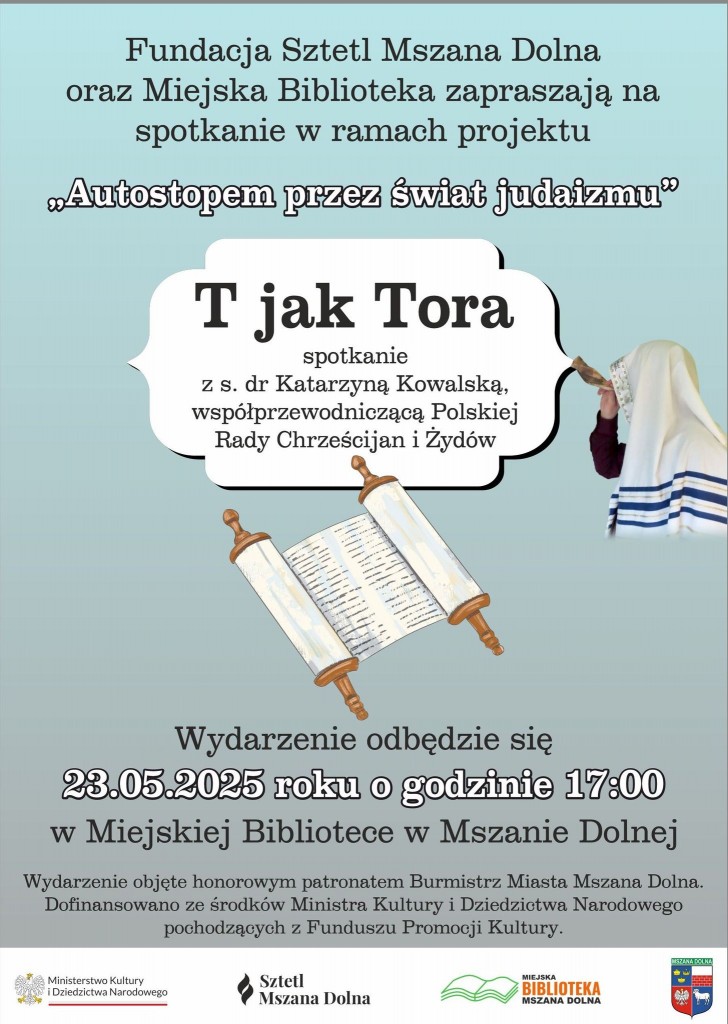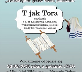 "Podstawą Twego słowa jest prawda" - mówi Psalm 119, najdłuższy z wszystkich, sławiący Torę i jej zgłębianie. 23.05.2025 r. w Miejskiej Bibliotece w Mszanie Dolnej odbyło się 3. spotkanie naszego projektu edukacyjnego "Autostopem przez świat judaizmu". Jego tematem było "T jak Tora".