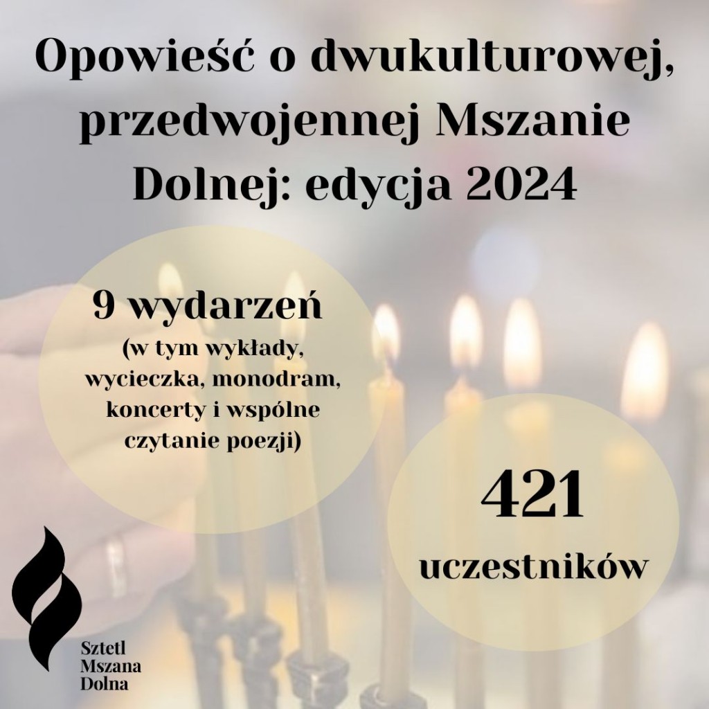 Odbyło się w jej ramach 9 wydarzeń, w których wzięło bezpośredni udział 421 osób. Niemal wszystkie były transmitowane i nagrywane, zatem odbiorców było o wiele więcej. Z nagraniami można się zapoznać na naszym profilu @sztetlmszanadolna na YouTube