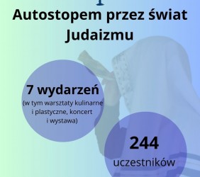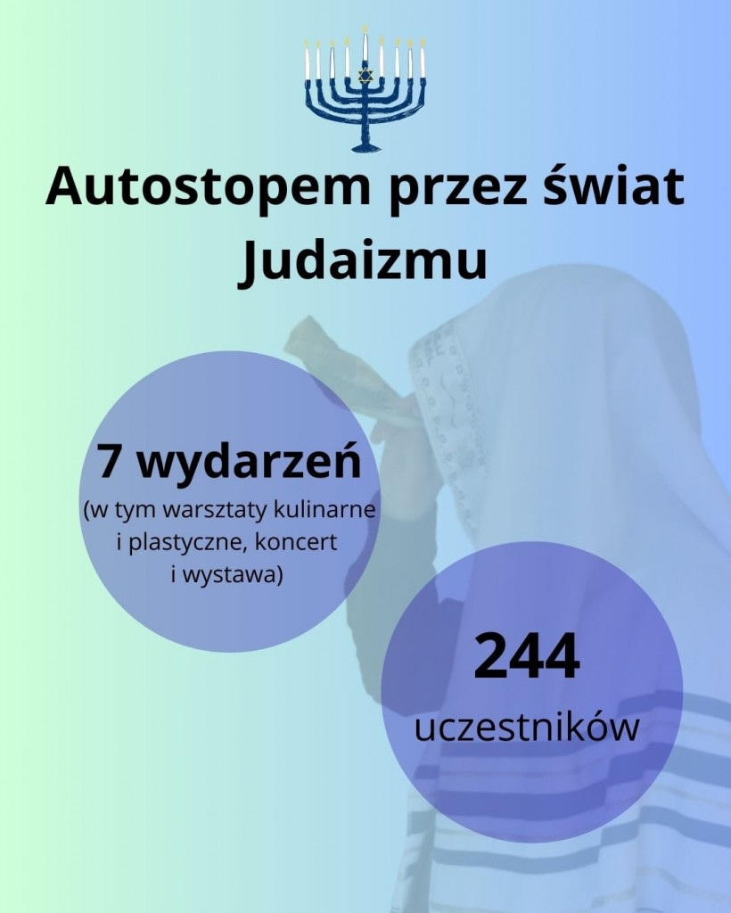 - Rozpoczęcia nowego projektu edukacyjnego "Autostopem przez świat judaizmu" z siedmioma wydarzeniami: o alfabecie hebrajskim, o mezuzie, menorze i mizrachu, o Torze, o filakteriach, o hummusie, błogosławieństwie domu i nigunach. Wzięło w nich udział 244 uczestników, nie licząc tych online