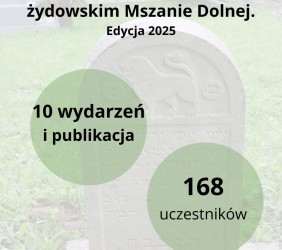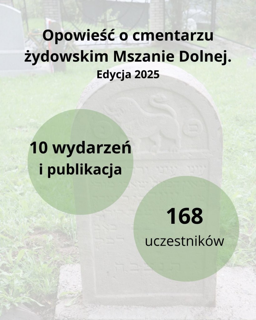 - Kolejnej edycji "Opowieści o cmentarzu żydowskim w Mszanie Dolnej" - z wolontaryjną opieką, porządkowaniami i oprowadzeniami, także w ramach Europejskich Dni Dziedzictwa. Tu mieliśmy 10 różnych wydarzeń ze 168 bezpośrednimi uczestnikami