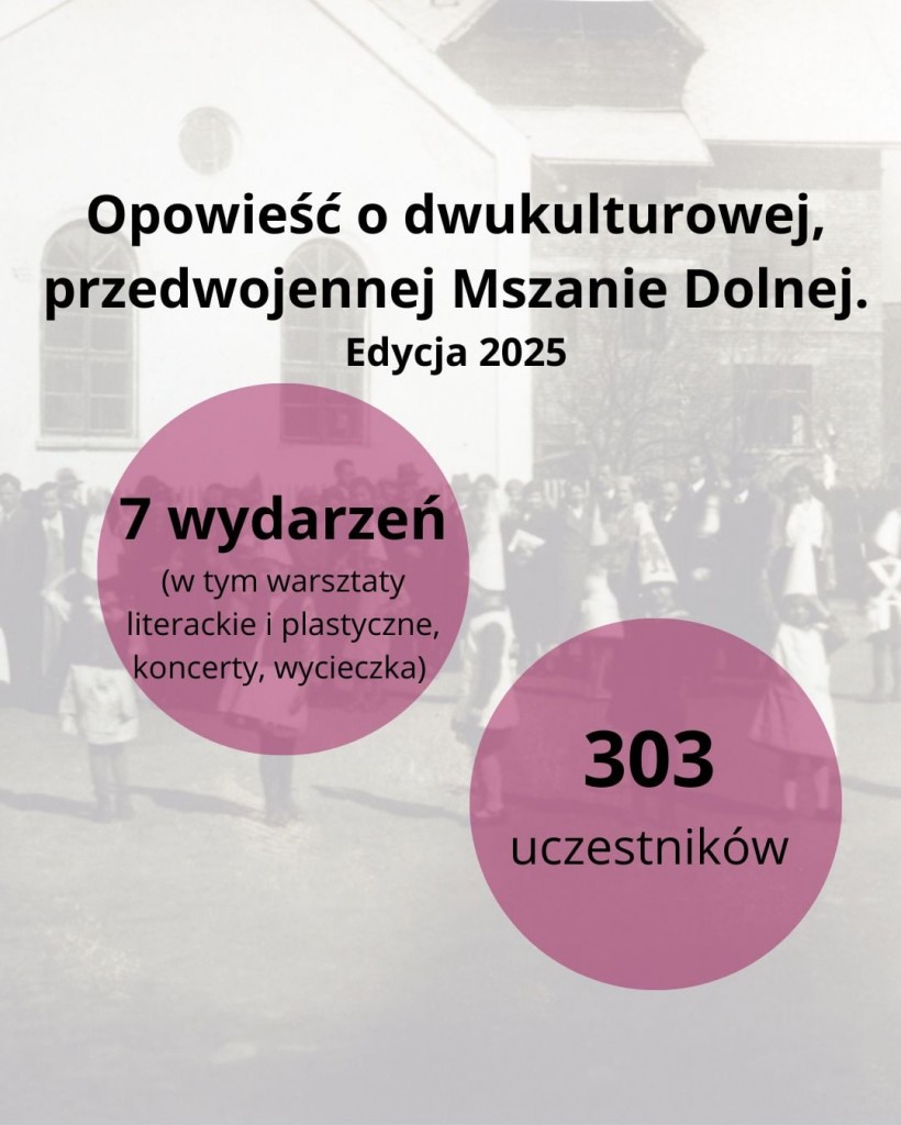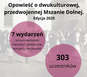 - Kolejnej, czwartej już edycji projektu "Opowieść o dwukulturowej, przedwojennej Mszanie Dolnej" z sześcioma spotkaniami i wycieczką śladem dwukulturowej Małopolski do Tarnowa i Dąbrowy Tarnowskiej. Tu mieliśmy 303 bezpośrednich uczestników, a wydarzenia były także transmitowane online