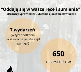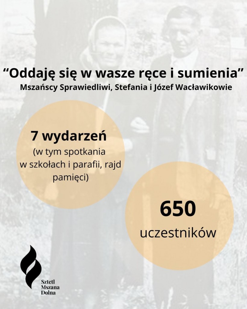 - Reaktywacji projektu o mszańskich Sprawiedliwych, z ich ponownym upamiętnieniem na Rynku, spotkaniami w szkołach, parafii, rajdem ich śladami z młodzieżą i konkursem na ich temat. W trwającym 9 miesięcy projekcie „Oddaję się w wasze ręce i sumienia” wzięło udział łącznie 650 uczestników, w 7 wydarzeniach