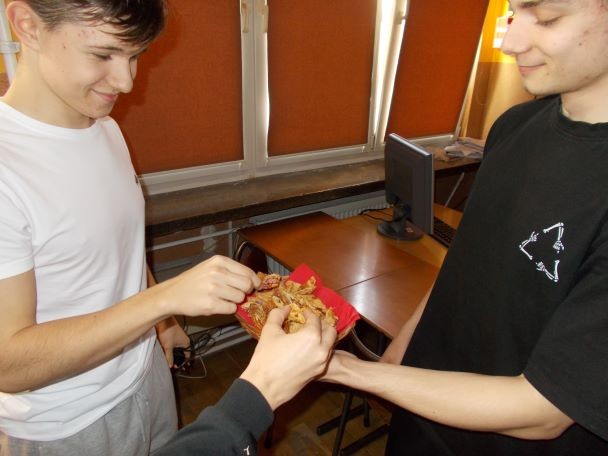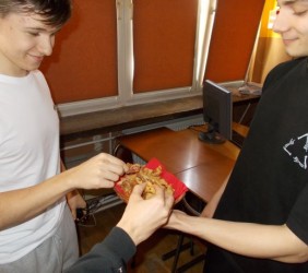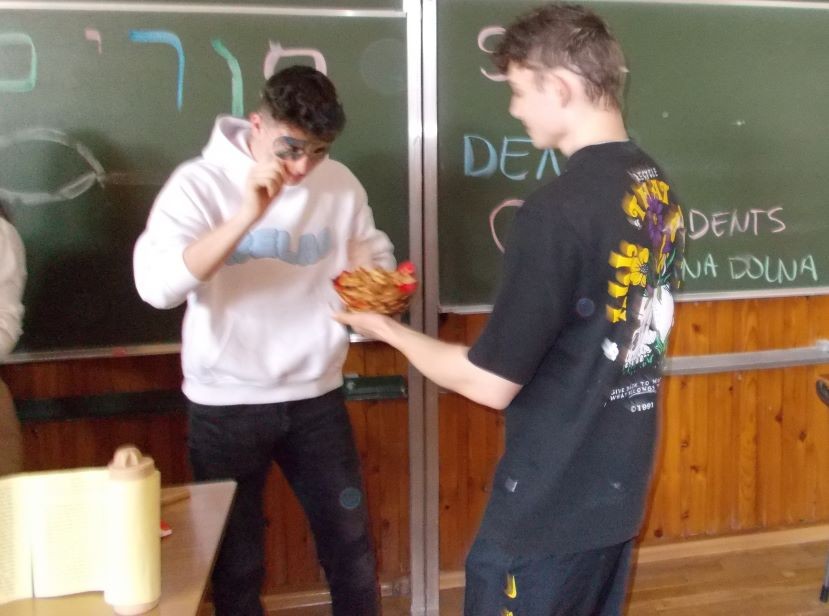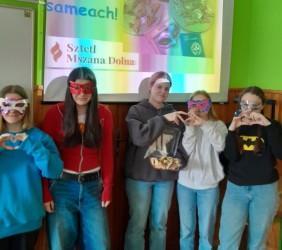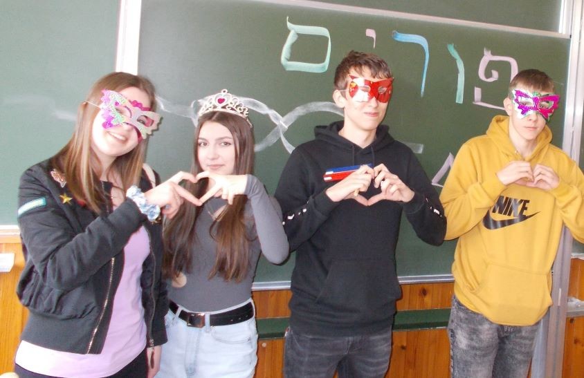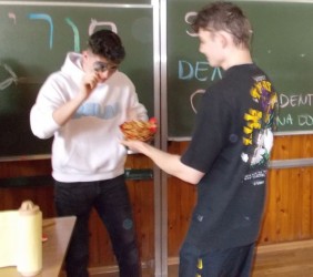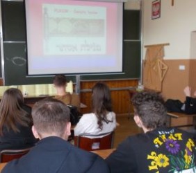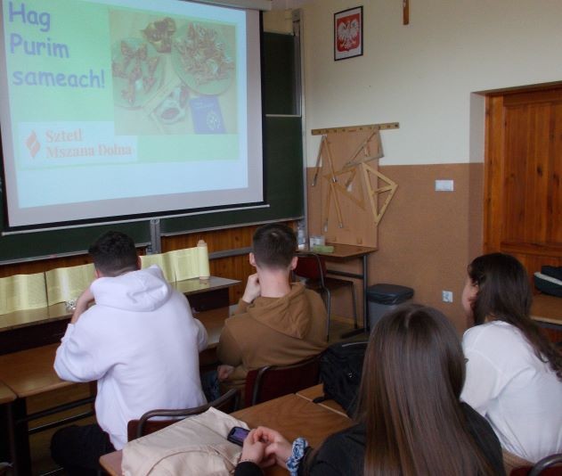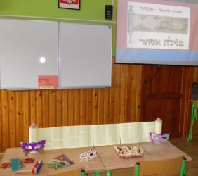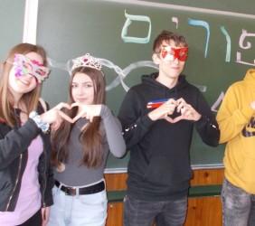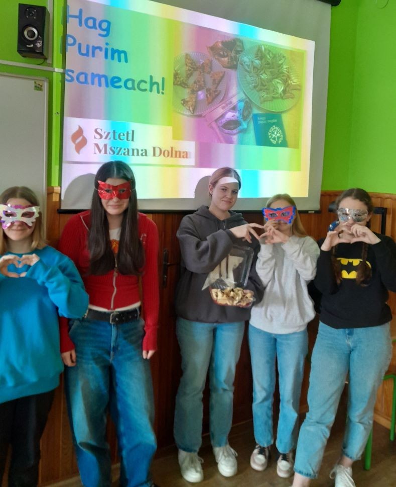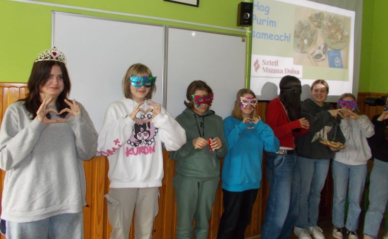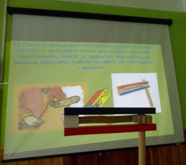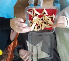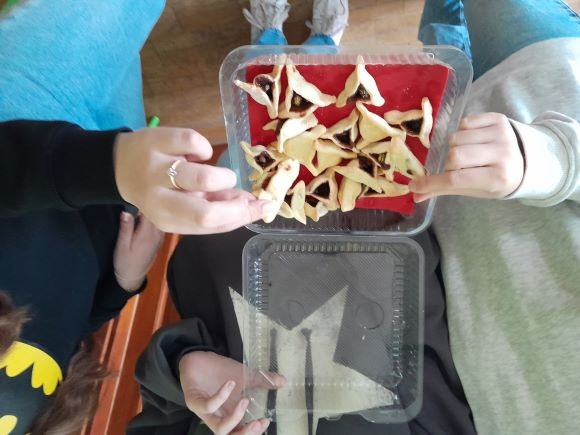 W tygodniu poprzedzającym tegoroczne święto Purim, przeprowadziliśmy warsztaty z 2 grupami młodzieży szkolnej. Uczniowie zapoznali się z prezentacją o tym święcie, jego atrybutami i zwyczajami, skosztowali hamantaszy - trójkątnych ciastek na Purim. Było też nieco "przebieranek" i odniesień do purimszpil jako początków teatru żydowskiego