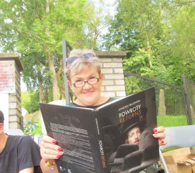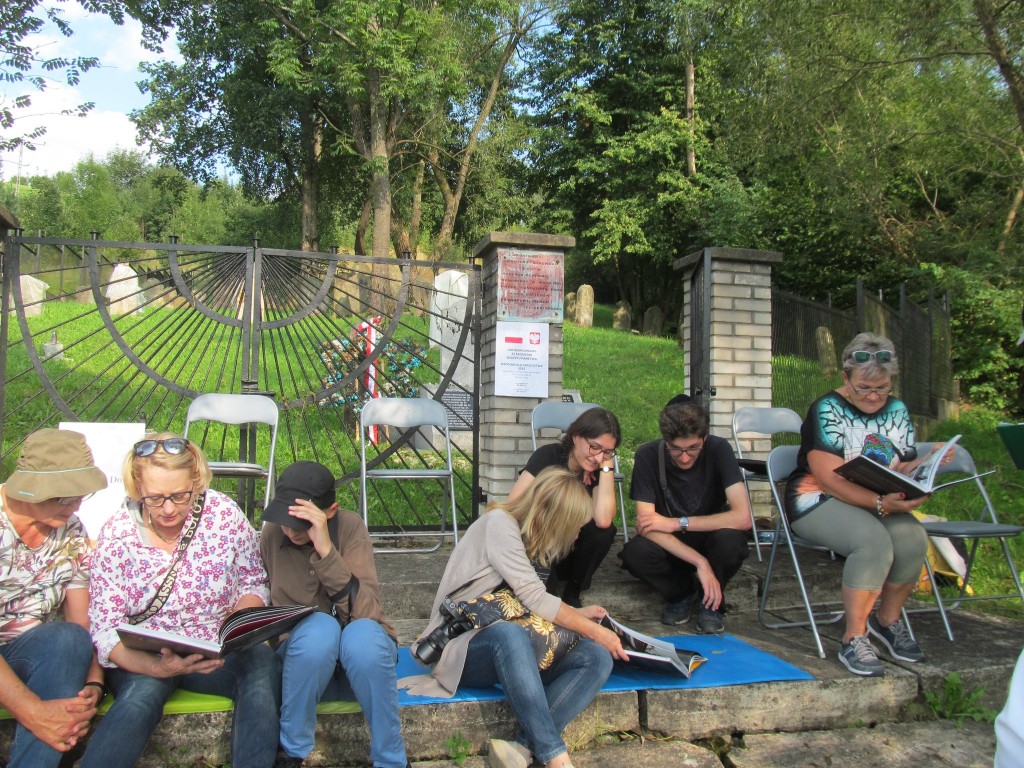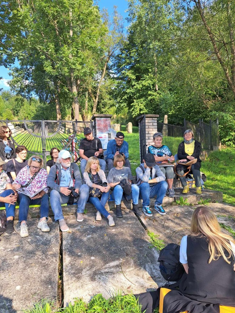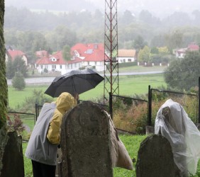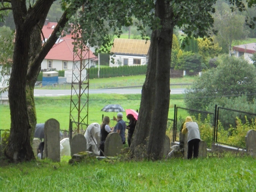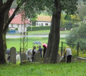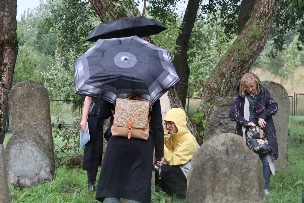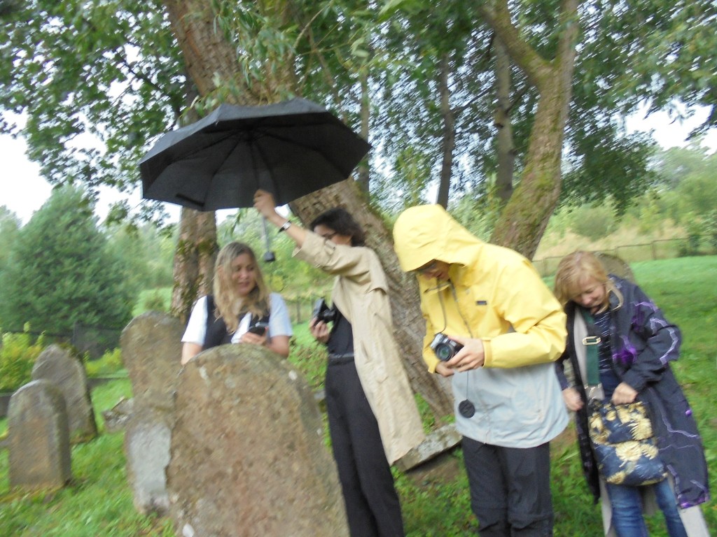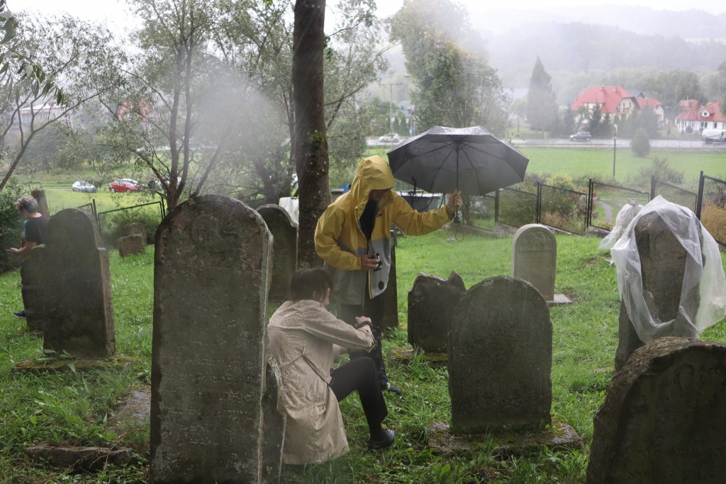 Pani Agnieszka rozpoczęłą warsztaty od opowieści o niedostępnym przeciętnemu człowiekowi świecie chasydów, swojej drodze do tego świata, początkach zainteresowania tematyką żydowską, która doprowadziła ją do bliskich relacji z ludźmi żyjącymi w dość hermetycznym świecie, do którego zwłaszcza kobiecie zajrzeć trudno. Poznawaliśmy twórczość tej niezwykłej fotografki oglądając wspomniane albumy, w zasadzie już niedostępne. Słuchaliśmy o jorcajtach - rocznicach śmierci sławnych cadyków, na które wciąż do Polski przybywają tłumy tajemniczych, czarnych postaci w kapeluszach i pejsach. I słuchalibyśmy jeszcze długo, gdyby nie nadciągająca ulewa! W pierwszych kroplach deszczu próbowaliśmy swoich sił w fotografii, zainspirowani ważnymi myślami prowadzącej. Niestety, same warsztaty trwały za krótko, ale - zainspirowani, wyszkoleni, żądni pracy, wrócimy jeszcze na cmentarz, by kontynuować pracę. Z wykonanych podczas warsztatów i w najbliższych dniach zdjęć, powstanie wystawa w Miejskiej Bibliotece, a Agnieszka Traczewska obiecała przyjechać na wernisaż, zatem będziemy mogli jeszcze posłuchać niedokończonych wątków, porozmawiać, zapytać o to, czego nie zdążyliśmy się dowiedzieć. Ulewa stworzyła zresztą niesamowitą scenerię i atmosferę, która - jak mamy nadzieję - zostanie utrwalona w pracach uczestników.