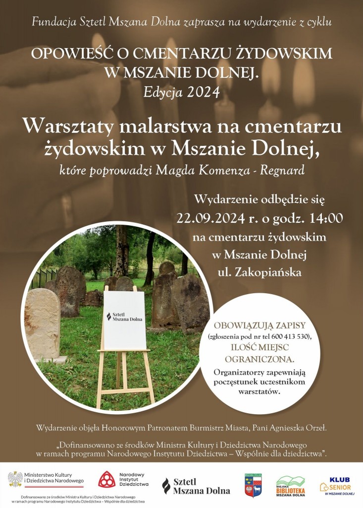 Wszystkie wykonane podczas warsztatów prace, zostaną zaprezentowane w Miejska Biblioteka w Mszanie Dolnej podczas podsumowania projektu, 25.10.2024 r. o godz. 17:00. Już dziś zapraszamy na to wydarzenie, podczas którego opowiemy także nieco o pamięci o zmarłych w judaizmie.