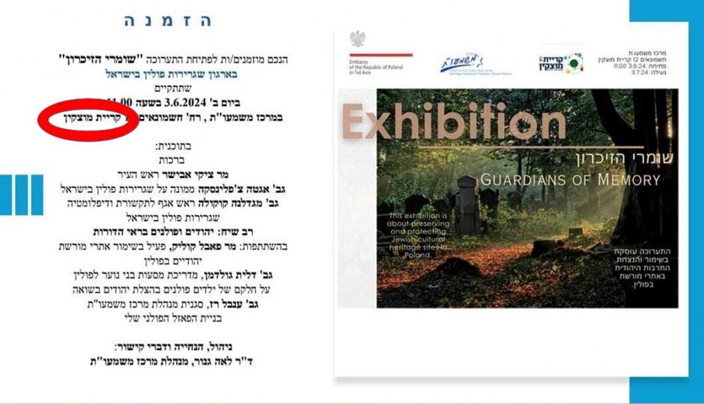 Po Uniwersytecie Hebrajskim w Jerozolimie, wystawa "The Guardians of Memory", przygotowana przez Ambasadę Polską w Tel Avivie, zagości w Kirjat Motzkin. Prezentuje ona "strażników pamięci" czyli organizacje i osoby z Polski, które dbają o żydowskie dziedzictwo, zwłaszcza zaś opiekują się cmentarzami żydowskimi.