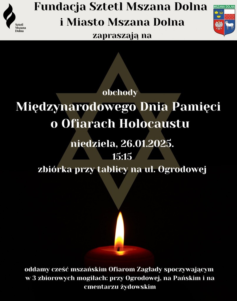 Wraz z władzami miasta, zapraszamy do uczczenia pamięci Ofiar Zagłady w Mszanie Dolnej, stąd pochodzących, oraz tu zamordowanych. Spotkamy się przy trzech zbiorowych mogiłach Ofiar: przy ul. Ogrodowej, na Pańskim oraz na cmentarzu żydowskim. Rozpoczęcie przy tablicy pamiątkowej przy ul. Ogrodowej, w niedzielę, 26.01.2025 o godz. 15:15. Można przynieść znicz, kamyk. Mężczyzn prosimy o nakrycie głowy. Przy mogiłach odmówimy Psalmy, zapalimy światło pamięci, oddamy cześć pomordowanym. Zapraszamy serdecznie wszystkich mieszkańców i gości!