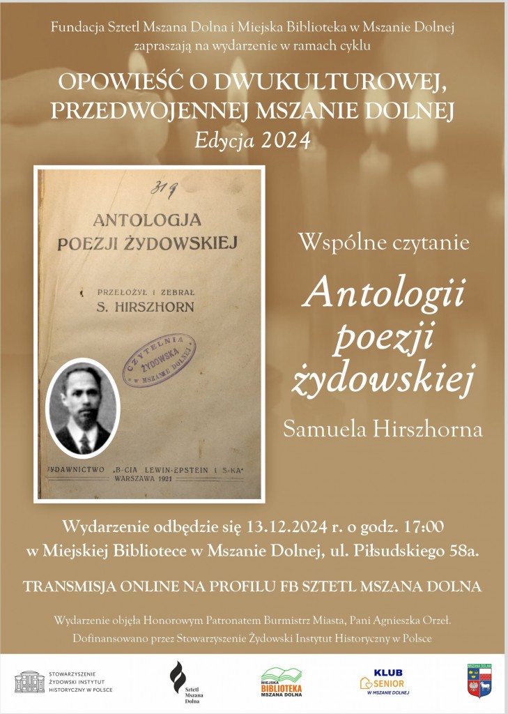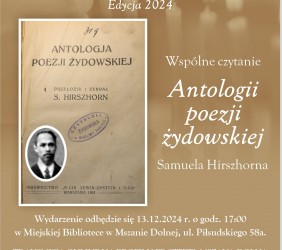 Samuel Hirschorn zginął w warszawskim getcie. Jego słowa brzmią jak testament, który chcemy wypełnić. Dlatego zapraszamy do wspólnego czytania wierszy z Antologii, które będzie miało miejsce 13.12.2024 r. o godz. 17:00 w Miejskiej Bibliotece w Mszanie Dolnej.