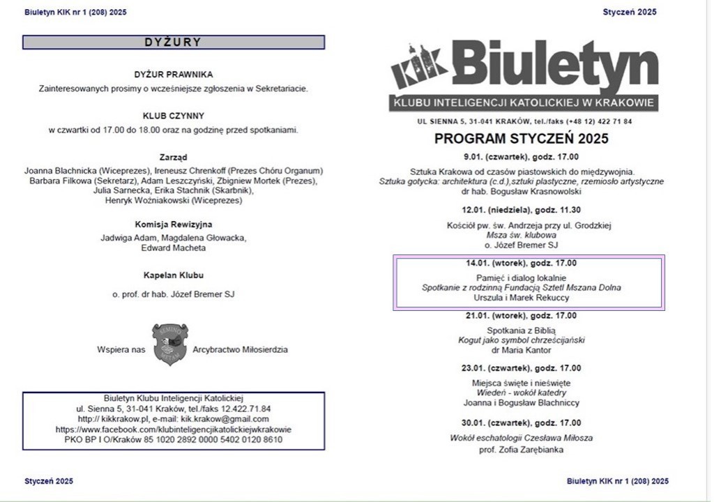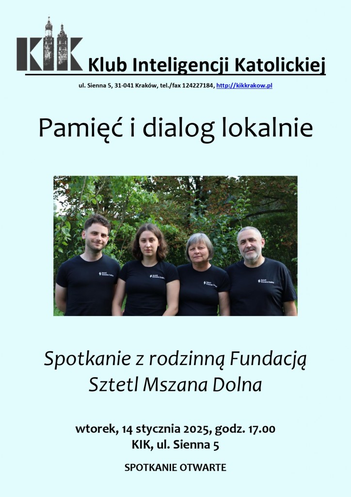 Zostaliśmy zaproszeni do Krakowa, by w Klubie Inteligencji Katolickiej, opowiedzieć o naszych działaniach wokół pamięci i dialogu w Mszanie Dolnej. Spotkanie odbędzie się 14.01.2025 o godz. 17:00 w sali Klubu, przy ul. Siennej 5. Serdecznie zapraszamy!