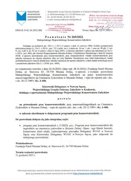 obejmujących prace przy zabytkowych macewach lub nagrobkach, w obiekcie wpisanym do